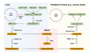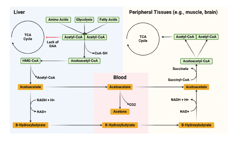Zonder voldoende oxaalazijnzuur kan acetyl-CoA niet meer de citroenzuurcyclus in. Tegelijkertijd blijft de aanvoer van acetyl-CoA doorgaan, vooral door de afbraak van vetzuren. Hierdoor ontstaat een ophoping van acetyl-CoA in de lever. Het lichaam heeft echter een metabole oplossing om met het overschot aan acetylCoA om te gaan. Het overtollige acetyl-CoA wordt namelijk omgezet in ketonlichamen. Dit proces begint met de vorming van acetoacetaat. Een deel van acetoacetaat wordt omgezet in β-hydroxybutyraat (BHB), dat door veel weefsels kan worden gebruikt als brandstof. Een klein deel van acetoacetaat wordt omgezet in aceton, dat bij gezonde mensen snel wordt afgebroken en ook wordt uitgeademd in kleine hoeveelheden. De productie van ketonlichamen is dus geen doel op zich, maar een gevolg van een opstapeling van acetyl-CoA in combinatie met een tekort aan oxaalazijnzuur.
